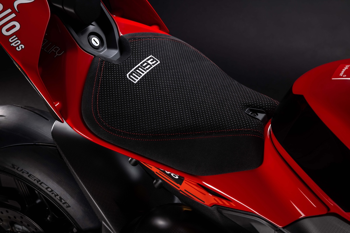 The bike is dressed in a factory-accurate Marc Márquez 2025 Ducati Lenovo MotoGP livery, accented by a deep racing red, black carbon, and bold white flashes. Each unit features a numbered billet triple clamp, an Alcantara seat, and a Marc Márquez autograph right on the tank. The electronic dash greets the rider with a dedicated key-on animation, and even the ignition key cover is serial-numbered.